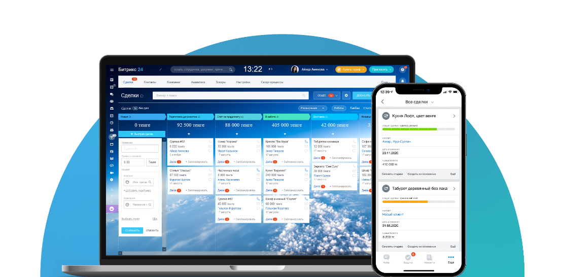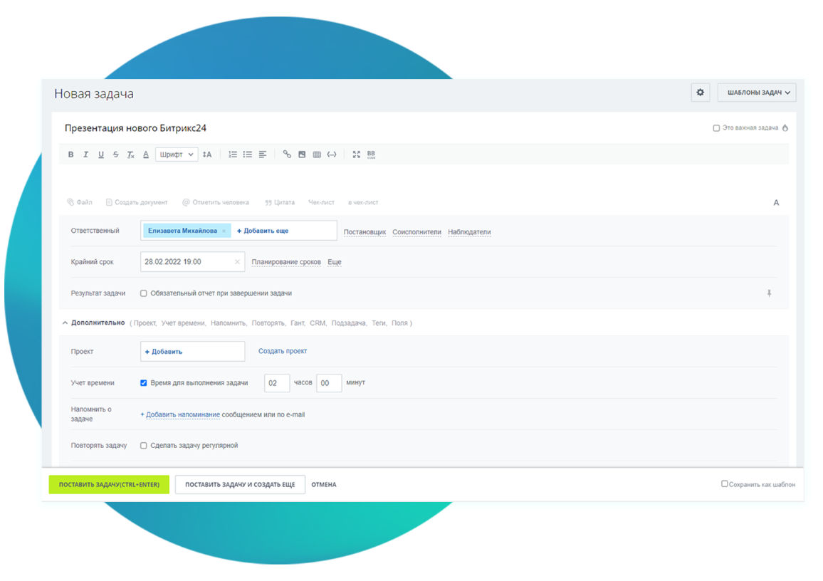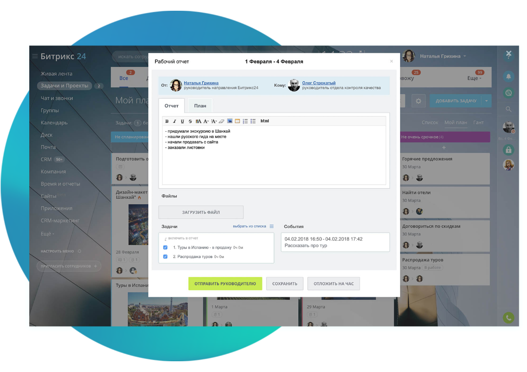 Битрикс24 фиксирует время начала и окончания работы, и перерывы. Каждый сотрудник «открывает» и «закрывает» рабочий день, списывает время на задачи и совещания.